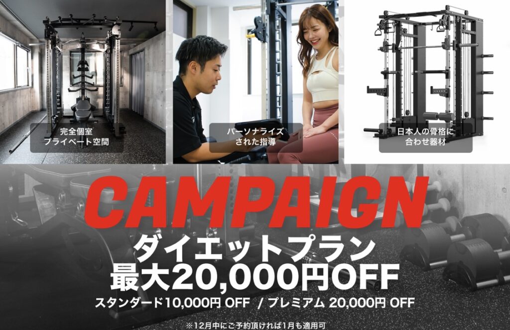 | 【プレミアム】 ※セッション24回+入会金+プロテイン+食事管理 | 通常312,000円 →264,000円(税込) (48,000円OFF) |